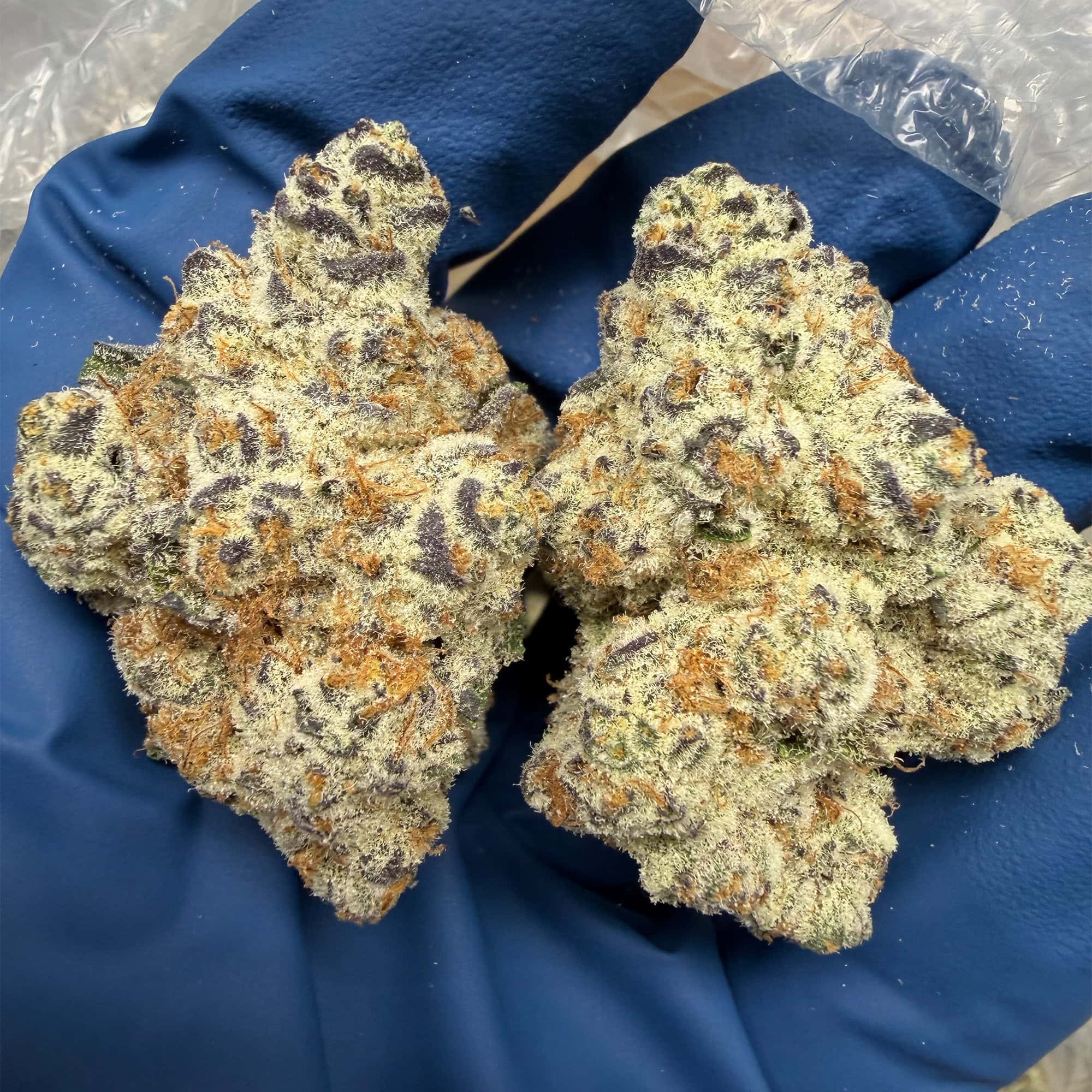 Right out the gate, Dantes Inferno grabs your attention with insane bag appeal. Deep purples swirl under thick frost, accented by bright orange pistils that pop against the dark backdrop. These buds aren’t just pretty—they’re sticky, dense, and trimmed to perfection. Every nug feels hand-selected for maximum visual impact.