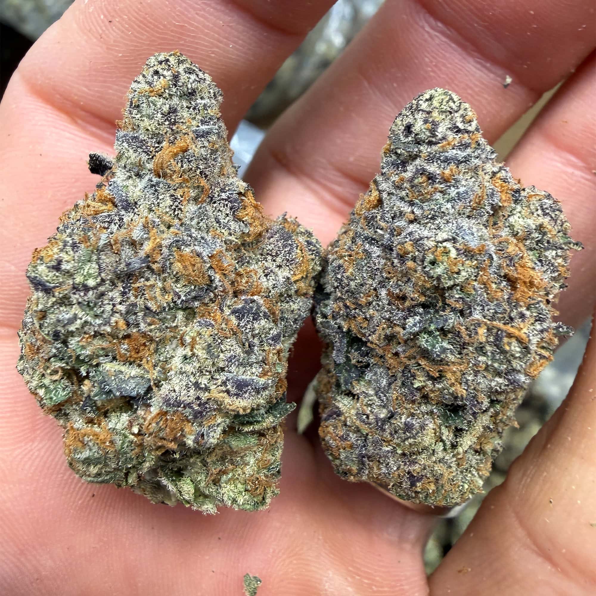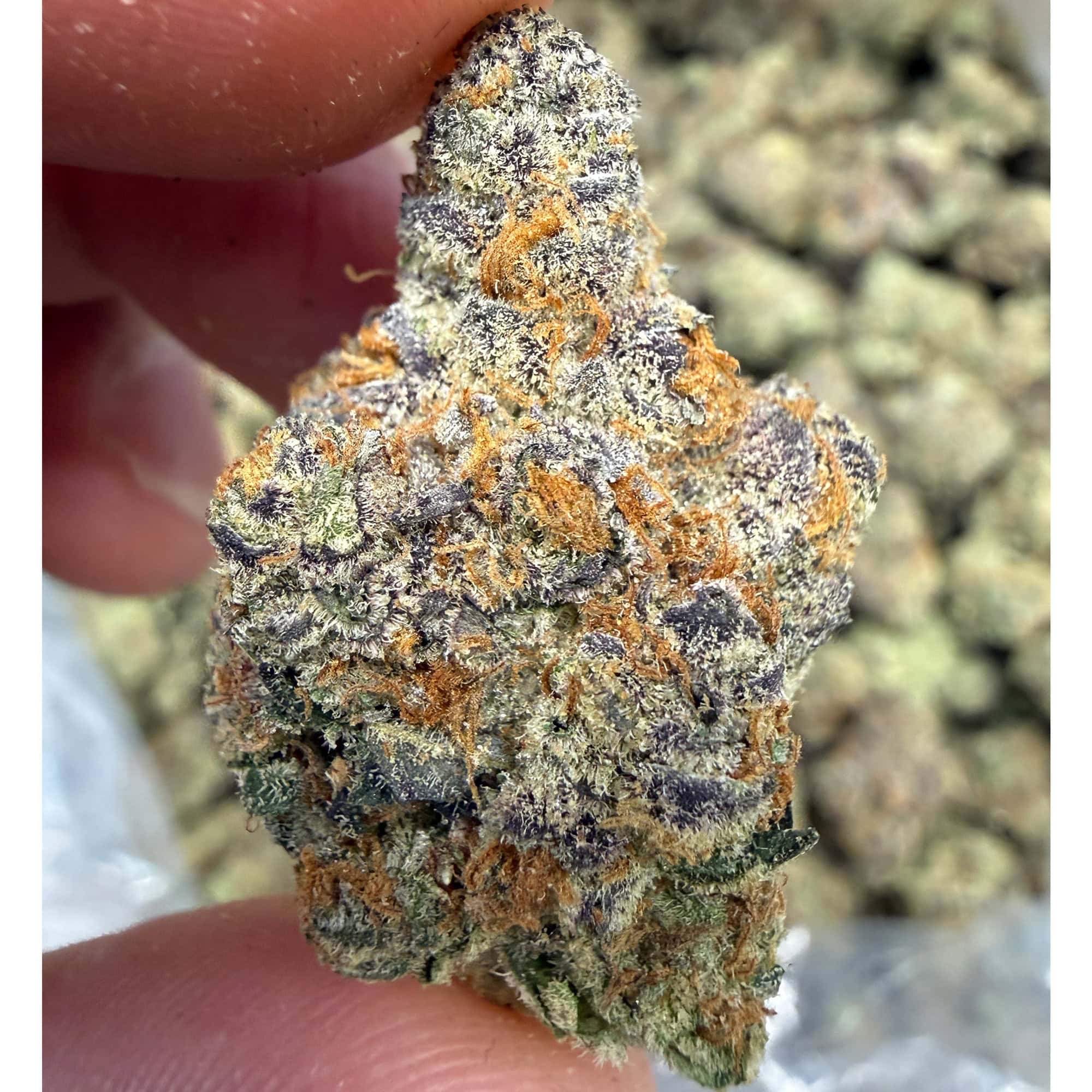 Pop open the bag and you’ll get smacked with a sweet berry blast backed by earthy, kushy depth. These buds aren’t just loud—they’re beautiful. Expect dense, sticky flowers with vivid green and purple tones, bright orange hairs, and a frosty trichome finish. The structure’s tight, the trim is clean, and the cure is on point.